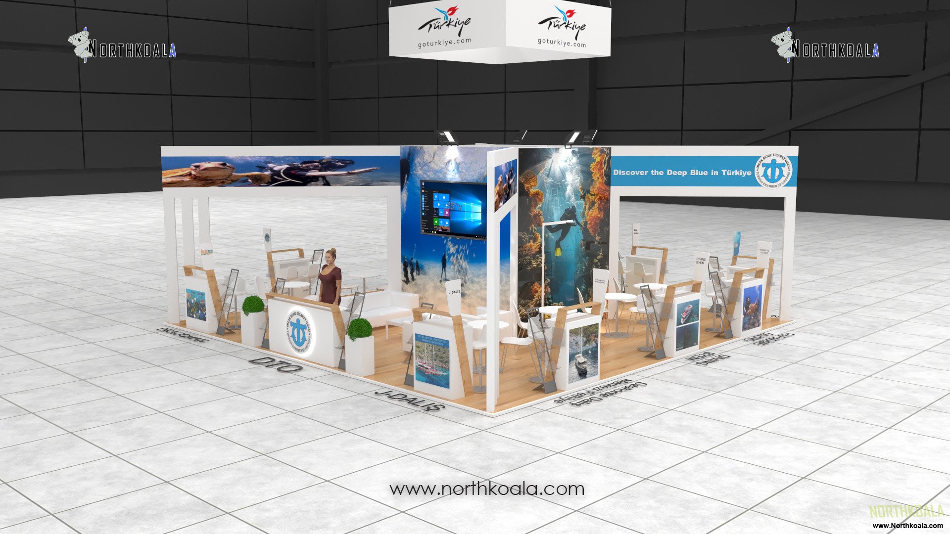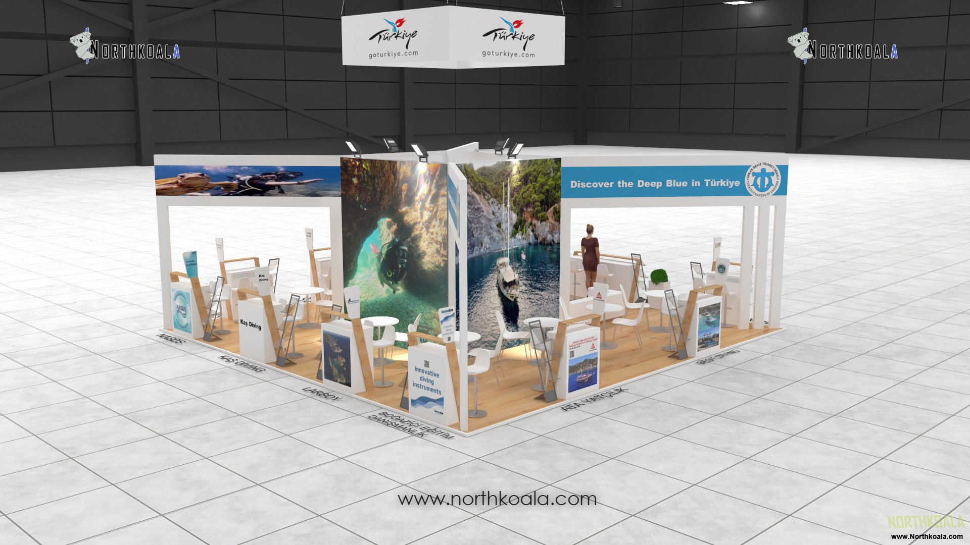 This stand invites visitors to discover the captivating marine life and underwater adventures Türkiye has to offer. With a central theme of diving and the deep blue sea, the stand features vibrant visuals of sea turtles and divers, immediately drawing attention to the beauty of underwater exploration.