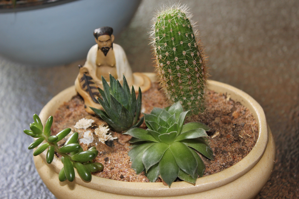 An Haworthia, some Aloe aristata (Guinea-fowl Aloe or Lace Aloe) and Peanut Cactus in an enamel bowl on my patio table. I often use some of my potted succulents as centre pieces for breakfast or lunch parties.